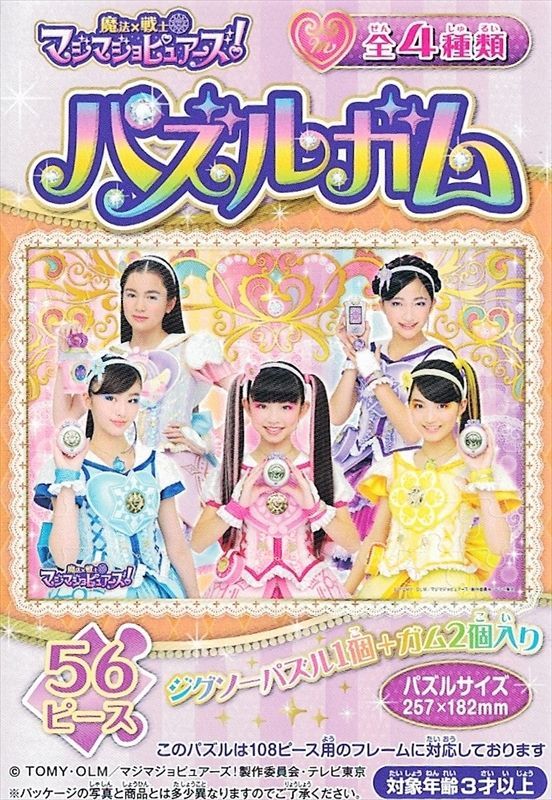 | 特徴 | 「魔法×戦士 マジマジョピュアーズ!」のパズルガムが登場。 パズルは56ピースのB5サイズ(257×182mm)で、ピースが大きめに作られているので小さなお子様にも組み立てやすくなっています。 絵柄は全4種類。 セット内容:ジグソーパズル(56pcs.)+ガム2個(粒ガム・イチゴ味 賞味期限:表示なし) |