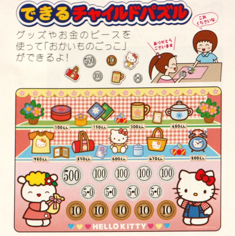 | 特徴 | 【チャイルドパズル/できる!シリーズ】幼児向け板パズル(ボードパズル)です。 グッズやお金のピースを使って「おかいものごっこ」ができるよ! 対象年齢:3才〜6才 |